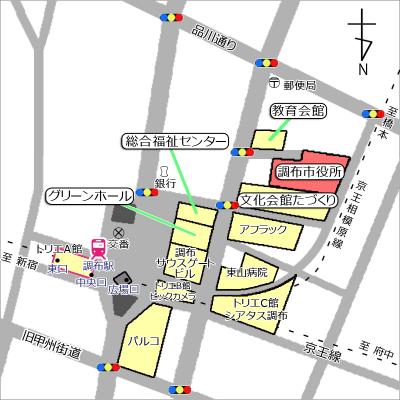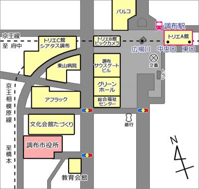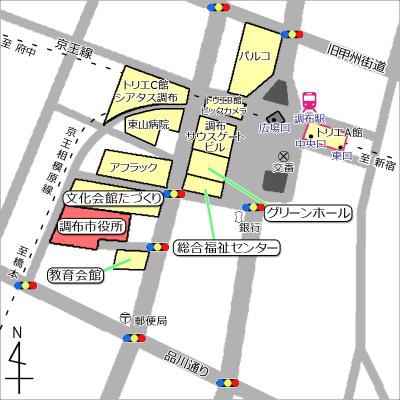 調布駅前広場から市役所周辺を案内した地図です。