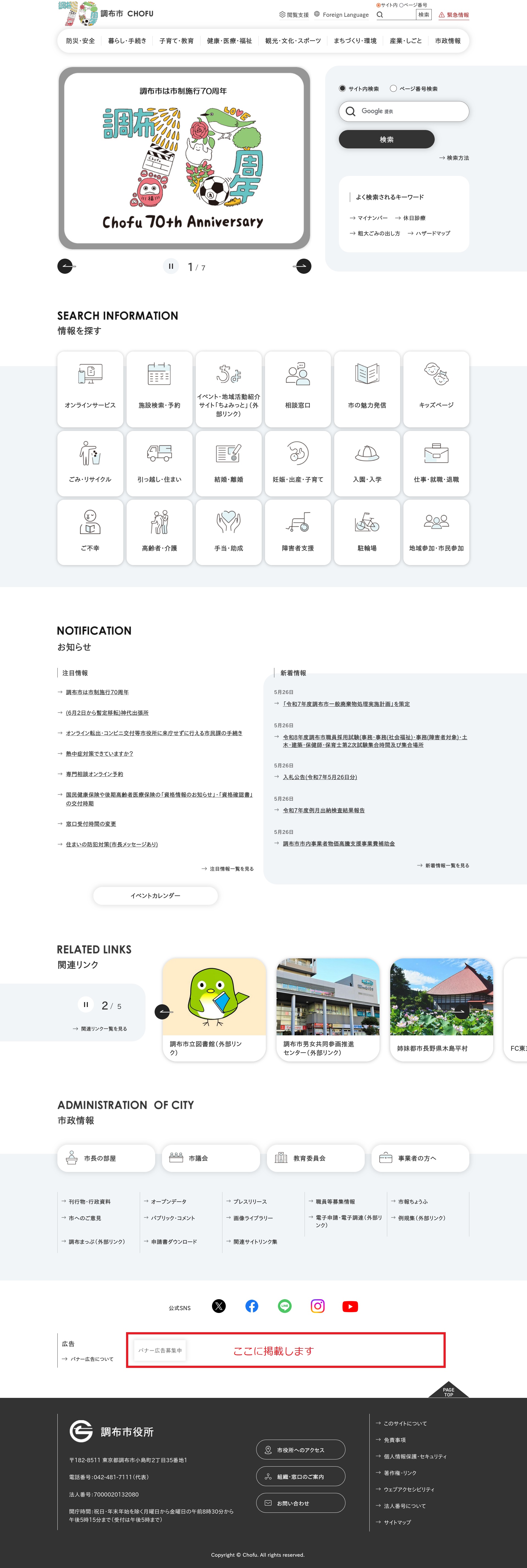 調布市ホームページ掲載するバナー広告の広告主を募集します。広告は、市ホームページのすべてのページに掲載されます。