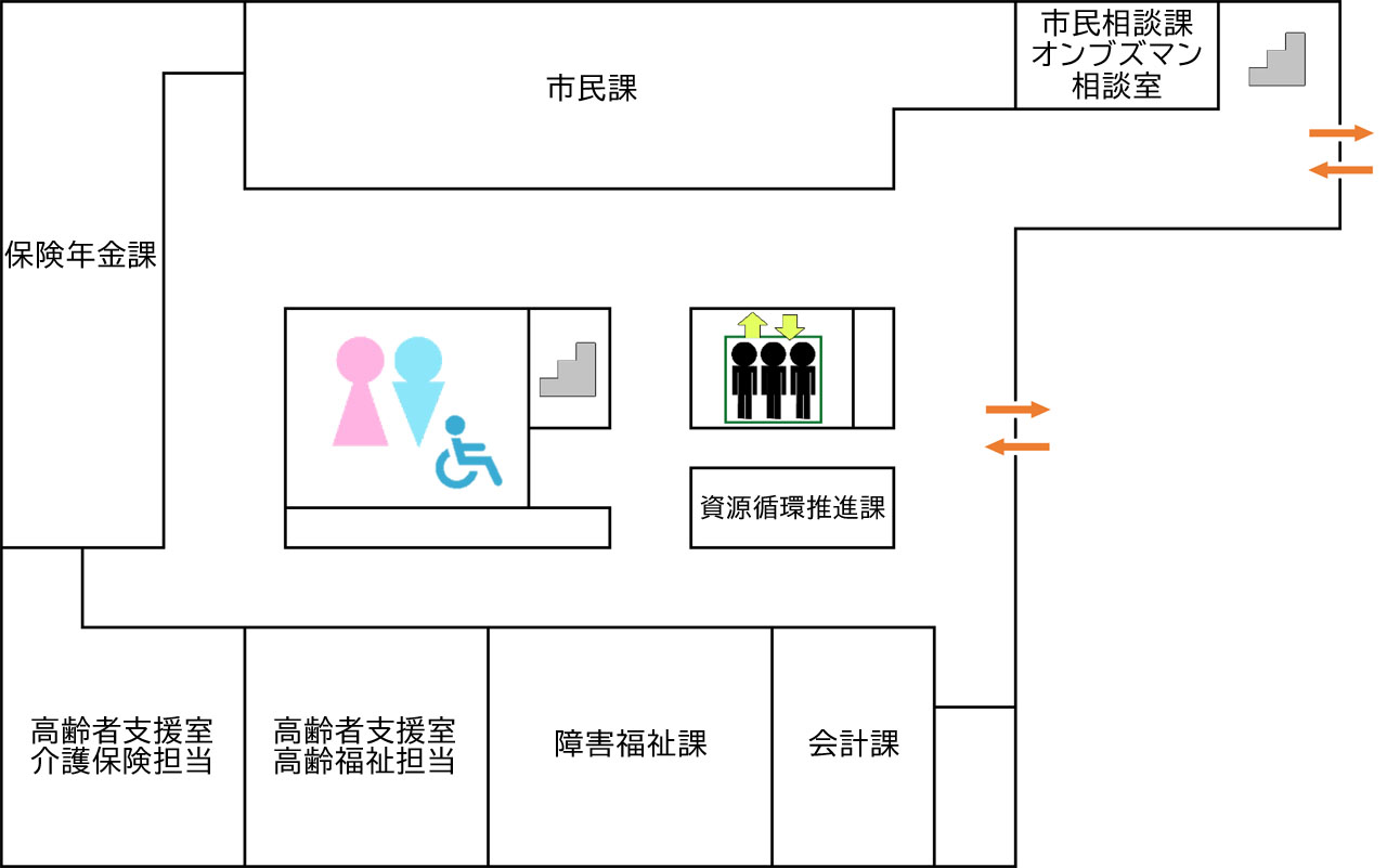 - 2階:市民相談課・オンブズマン相談室、市民課、保険年金課、高齢者支援室介護保険担当、高齢者支援室高齢福祉担当、障害福祉課、会計課(指定金融機関派出所)、資源循環推進課
