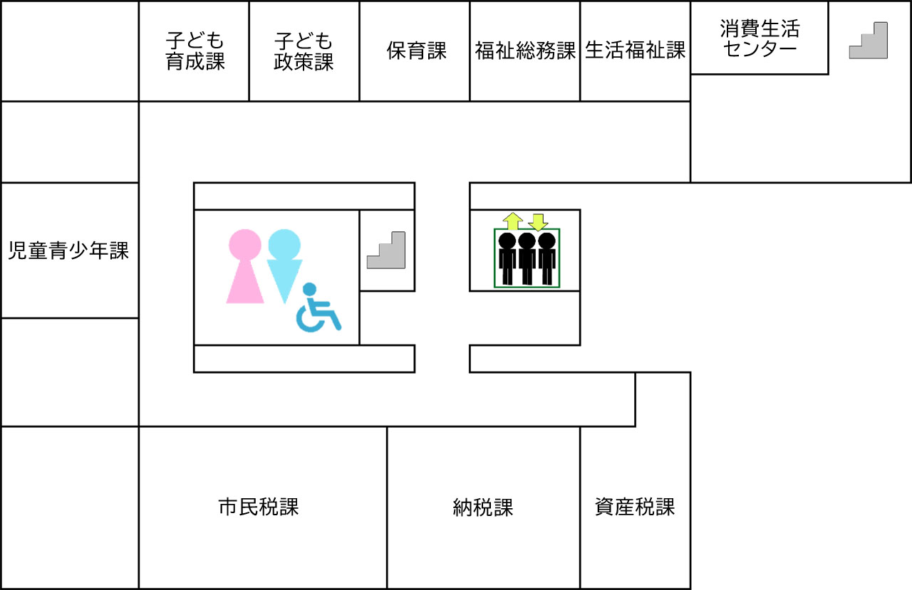 - 3階:生活福祉課、福祉総務課、保育課、子ども政策課、子ども育成課、児童青少年課、市民税課、納税課、資産税課、消費生活センター