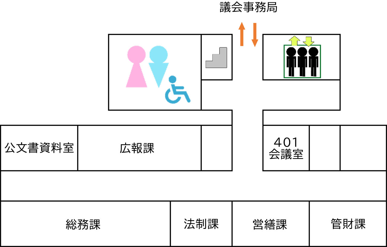 - 4階:広報課、公文書資料室、総務課、法制課、営繕課、管財課、議会事務局、401会議室