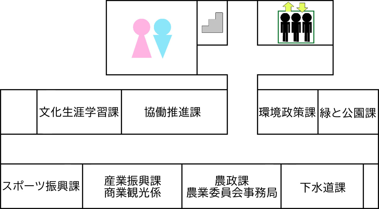 - 8階:協働推進課、文化生涯学習課、スポーツ振興課、産業振興課、農政課・農業委員会事務局、下水道課、緑と公園課、環境政策課