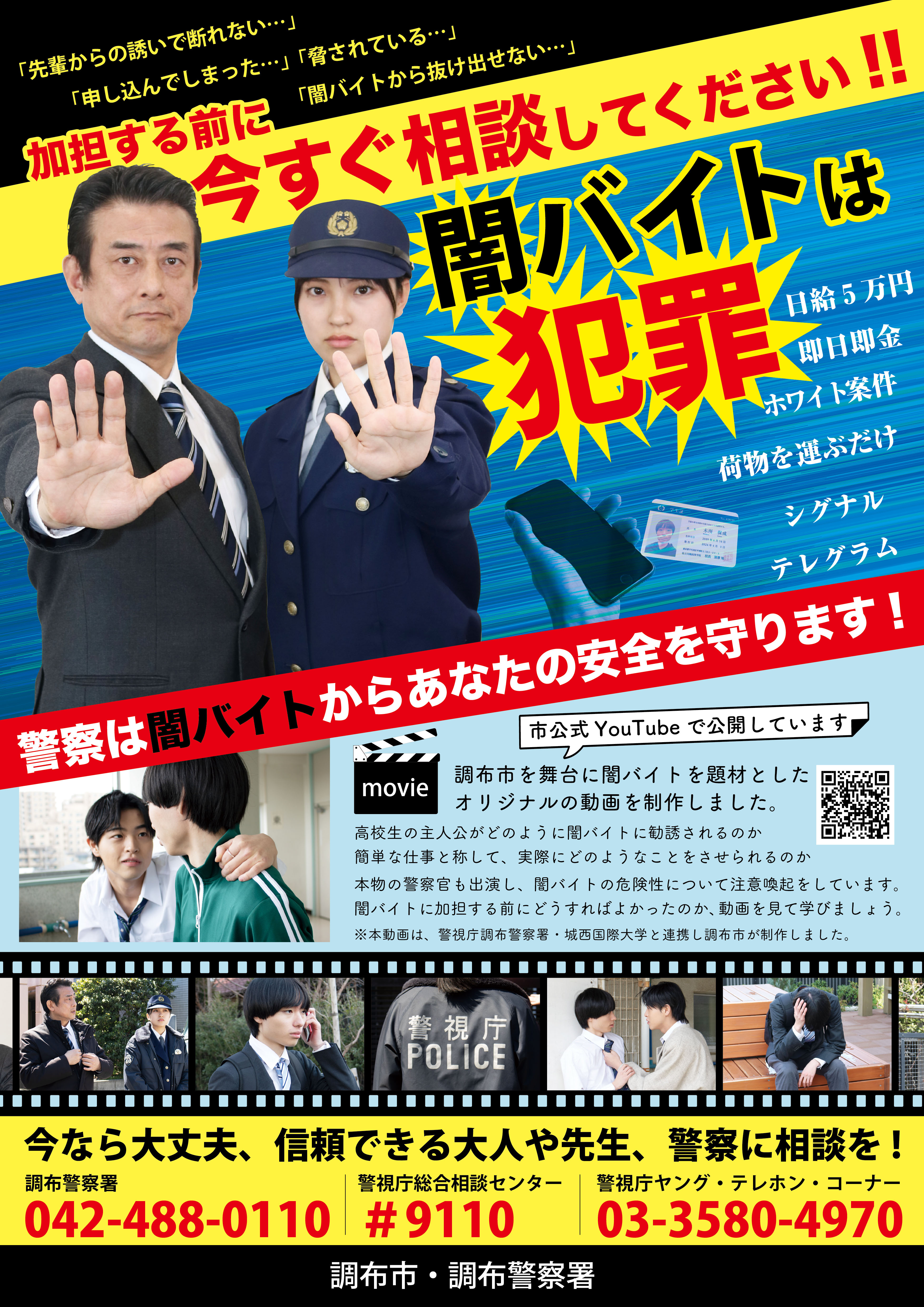 闇バイトに加担しないために、調布市を舞台としたオリジナル動画を調布警察署・城西国際大学と連携し、制作しました。高校生の主人公がどのように闇バイトに勧誘されるのか、簡単な仕事と称して、実際にどのようなことをさせられるのか、本物の警察官も出演し、闇バイトの危険性について注意喚起をしています。