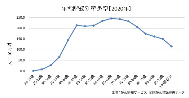 これは、2020年に乳がんと診断された人の年齢階級別の割合をグラフにしたものです。このグラフを見て分かるように、40歳代以上で乳がんにかかる人が急増しています。