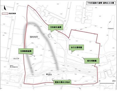 調布市教育委員会は、遺跡の恒久的な保護に向けて昭和53年度から57年度の5か年間、国庫補助事業による範囲確認調査を実施しました。その結果、新たに、方形配石遺構や合口土器棺墓などが確認され、遺跡の重要性がさらに高まりました。これらの調査成果により、下布田遺跡は、縄文文化終末期の墓制や祭祀をはじめとする精神文化を探り、狩猟採集社会から農耕社会へと移行する複雑な社会構造を究明する上で重要な遺跡として評価され、昭和62年5月12日に遺跡南部の約5000平方メートルの地区が国の史跡に指定されました。
