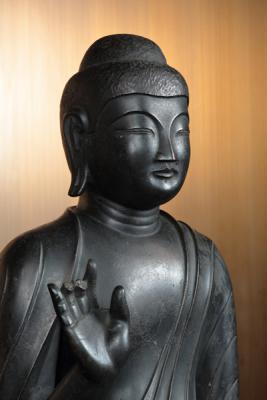 東日本最古の国宝仏。椅子に腰掛ける姿の釈迦如来像で、明るい表情を浮かべた少年を思わせる面貌や、美しい着衣のしわを表現した衣文など、白鳳時代の仏像の特色が表れています。